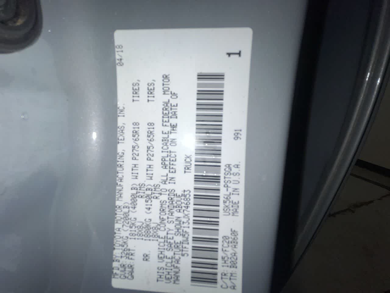 SR5 UPGRADE PACKAGE front center console w/3 cupholders and replaces standard equipment column shifter w/floor mounted urethane shift lever and knob, Compass, Anti-Theft Immobilizer w/Alarm, Urethane Tilt/Telescopic Steering Wheel, Auto-Dimming Rearview Mirror, 38 Gallon Fuel Tank Capacity, Front Bucket Seats, 8-way power-adjustable drivers seat w/power lumbar support and 4-way manual adjustable front passenger seat, HomeLink Universal Transceiver, CONVENIENCE PACKAGE Blind Spot Monitor w/Rear Cross Traffic Alert, Color-Keyed Rear Bumper, Front & Rear Parking Assist Sonar, WHEELS: 18 X 8J 5-SPOKE ALLOY Tires: P275/65R18 AS, BRUSHED STAINLESS STEEL STEPBOARDS. MP3 Player, Keyless Entry, Privacy Glass, Child Safety Locks, Electronic Stability Control.