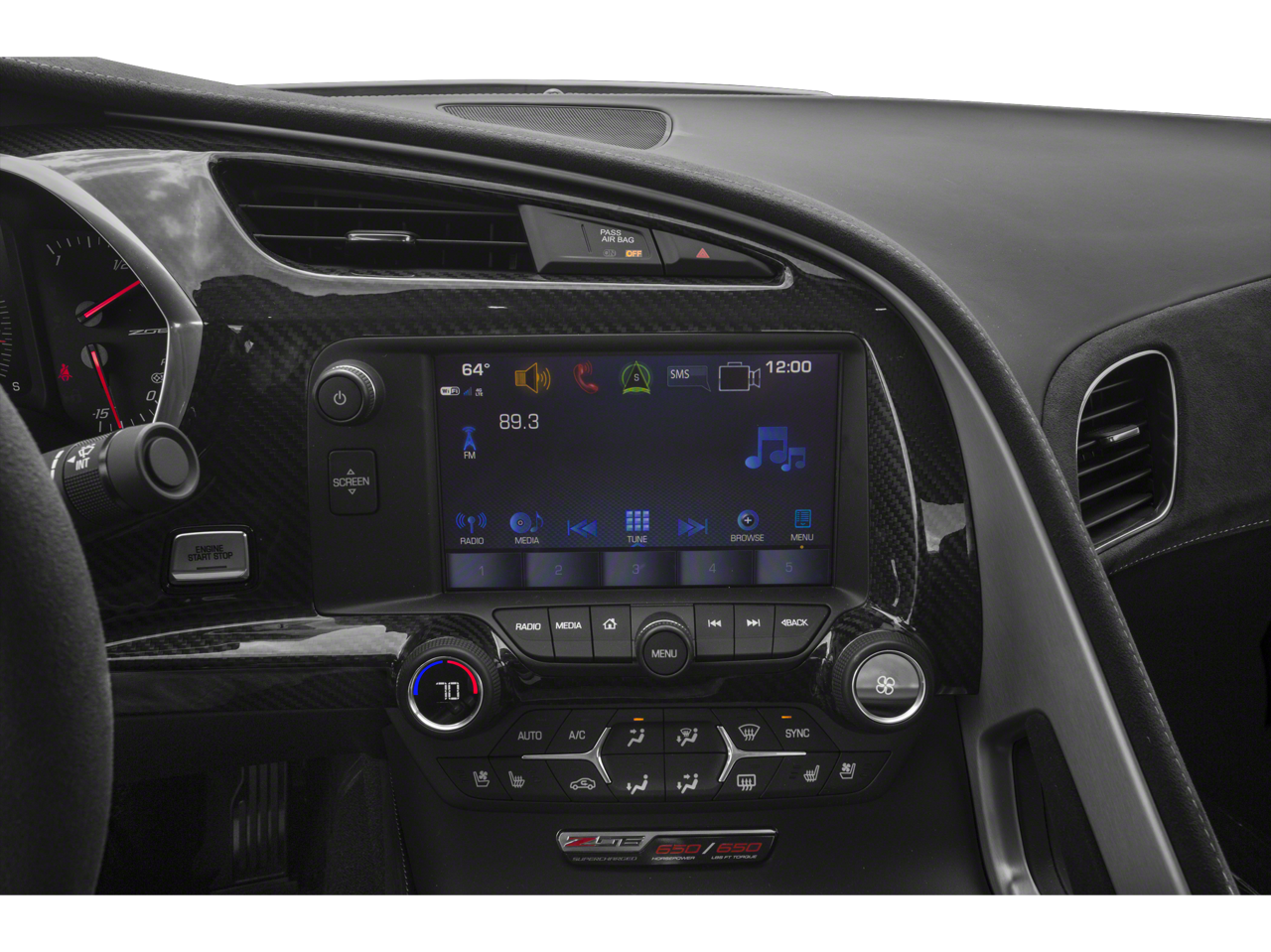 TRANSMISSION, 8-SPEED PADDLE SHIFT WITH AUTOMATIC MODES, WHEELS, Z06 BLACK-PAINTED ALUMINUM 19 x 10 (48.3 cm x 25.4 cm) front and 20 x 12 (50.8 cm x 30.48 cm) rear, REMOTE VEHICLE STARTER SYSTEM, REAR AXLE, 2.41 RATIO, ELECTRONIC LIMITED SLIP (ELSD), AUDIO SYSTEM, CHEVROLET INFOTAINMENT SYSTEM with 8 diagonal color touch-screen, AM/FM/HD stereo with seek-and-scan and digital clock, includes Bluetooth® streaming audio for music and select phones; voice-activated technology for radio and phone; featuring Android Auto® and Apple CarPlay® capability for compatible phone (STD), ENGINE, 6.2L (376 CI) SUPERCHARGED V8 DI (650 hp [485 kW] @ 6400 rpm, 650 lb-ft of torque [881 N-m] @ 3600 rpm) (STD).